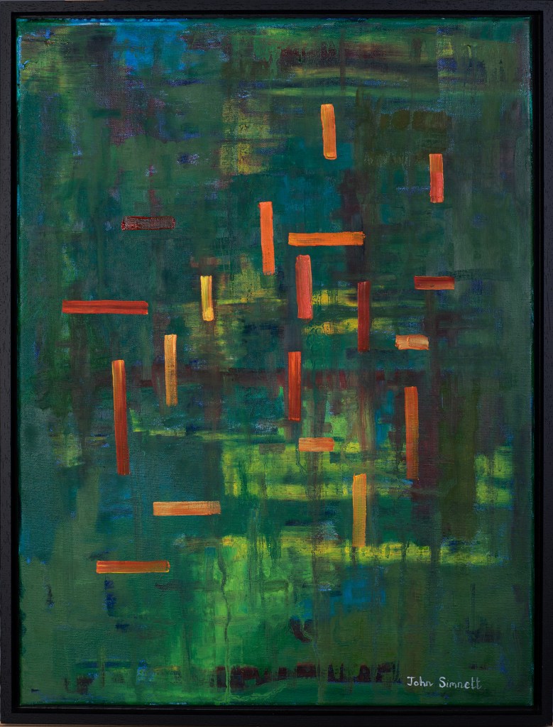 A tranquil picture, experimenting with gravitational pulls on the oils, reminiscent of a watery landscape in the jungle. Oil on canvas, using cold wax and solvents.